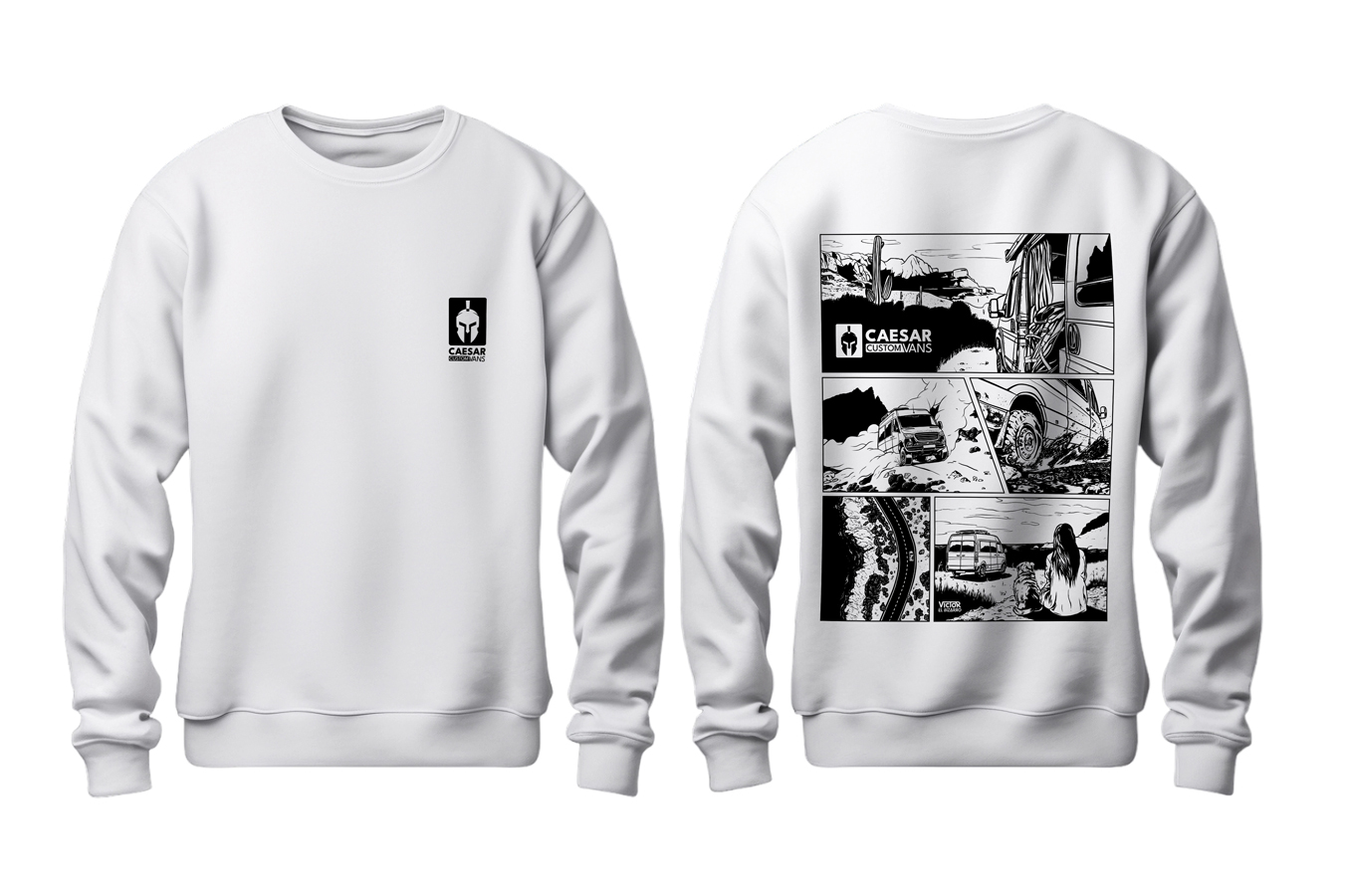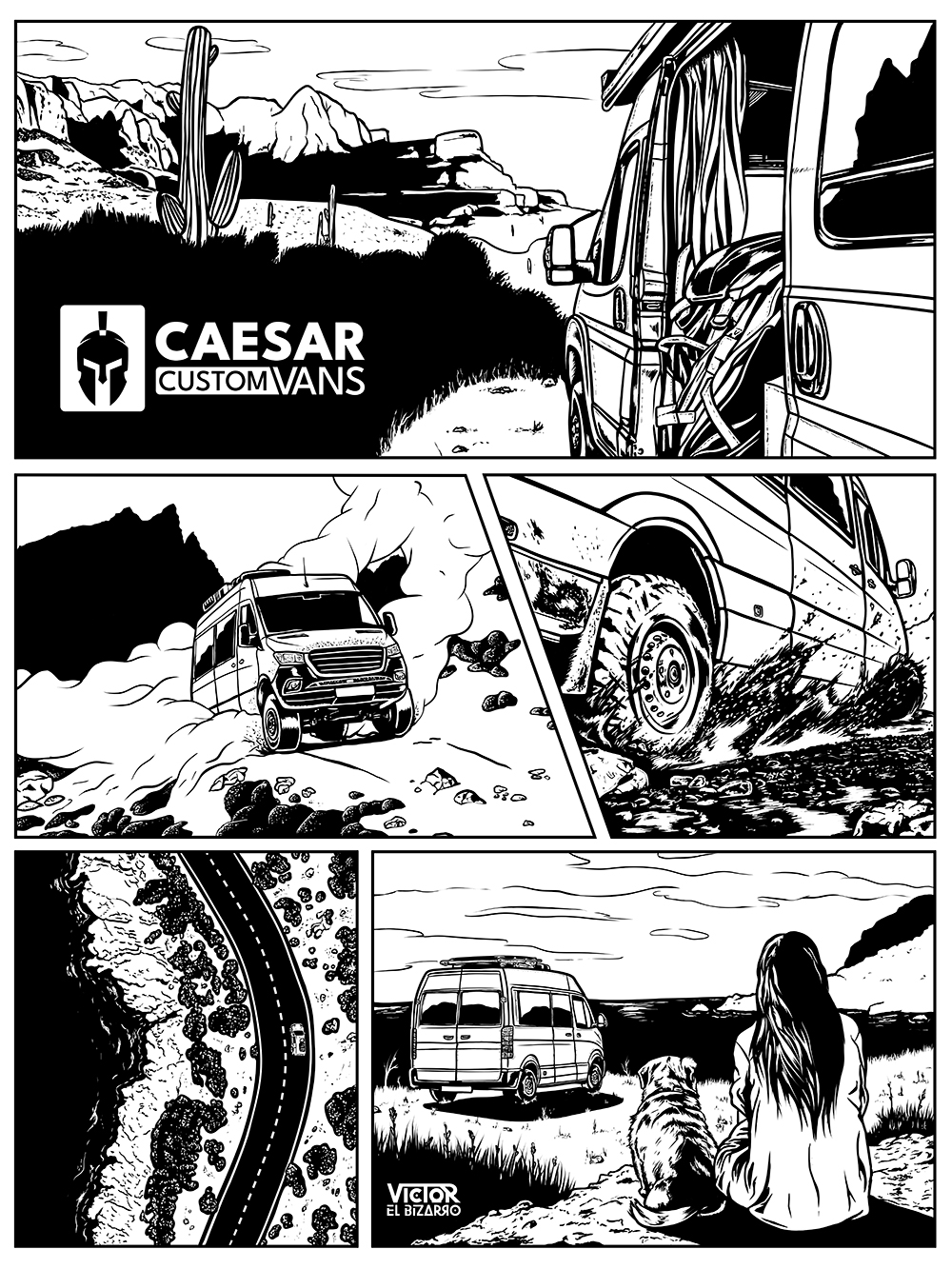 Todas estas premisas se plasman gráficamente mediante una serie de viñetas en las que el alma de Caesar Custom Vans se vuelve una experiencia palpable que te acompaña en cada uno de tus viajes.