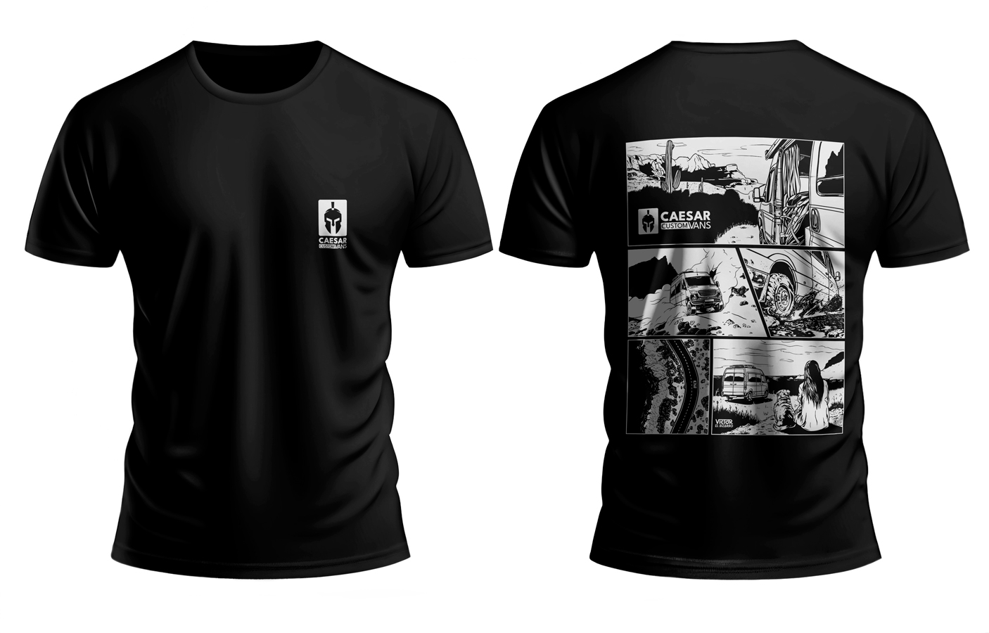 Caesar Custom Vans es una empresa puntera, innovadora, que cuida todos los aspectos y detalles para customizar cada vehículo a las especificaciones indicadas por el cliente. Pero no es solo una empresa, es un modo de vida. Y ello debía quedar reflejado en su camiseta. “De la montaña a la playa” es la base del diseño. La oportunidad de ser libre y desplazarse sin preocupaciones, de vivir experiencias al volante y en cada parada: disfrutar de la vida teniendo a tu alcance una navaja suiza de posibilidades con cuatro ruedas.