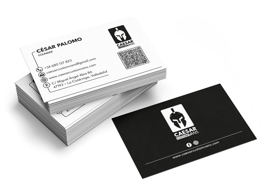 Por el contrario, el reverso tiene una intención publicitaria y de anclaje de la marca. En un fondo negro que potencia el imagotipo, se incluyen los isotipos de las redes sociales en las que Caesar Custom Vans está presente, al igual que la web de la empresa.