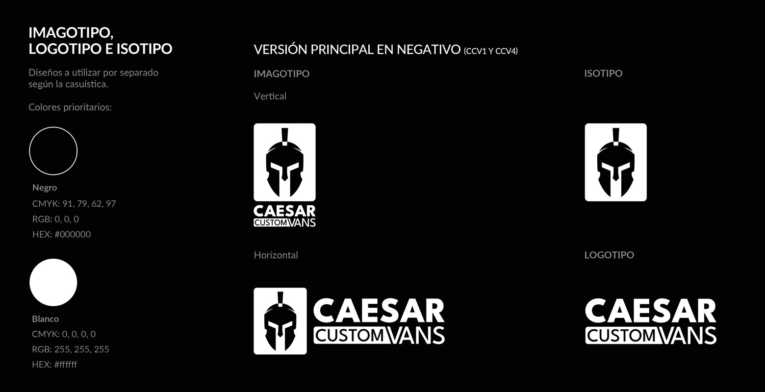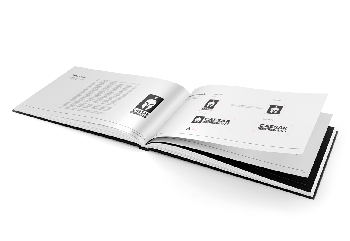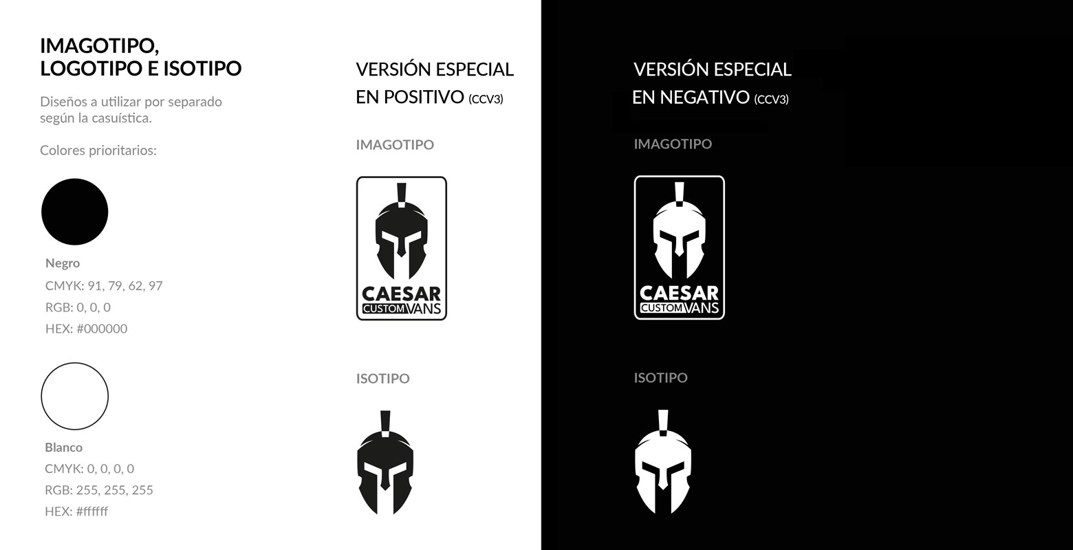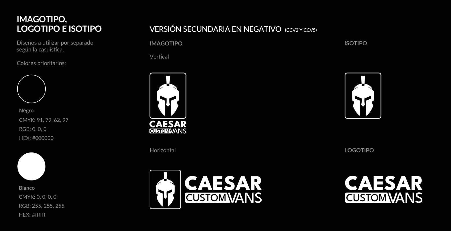 El imagotipo de Caesar Custom Vans se distingue por su potencia visual y su significado intrínseco. Un yelmo estilizado que evoca a la época clásica encabeza el imagotipo. Enmarcado en una pastilla negra, su geométrica presencia y cuidadas líneas se ven realzadas. A continuación, el nombre de la marca. En combinación con el isotipo y escrito en latín, se convierte en una referencia directa a los tiempos de uno de los más grandes conquistadores: César —que el propietario de la empresa se llame igual, es pura coincidencia (guiño, guiño)—. Una referencia directa al buen hacer, a una época dorada en la que la profesionalidad, la calidad de materiales y minuciosidad en los acabados eran parte del día a día. La pulcritud en estado puro.