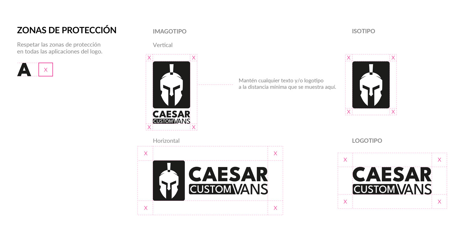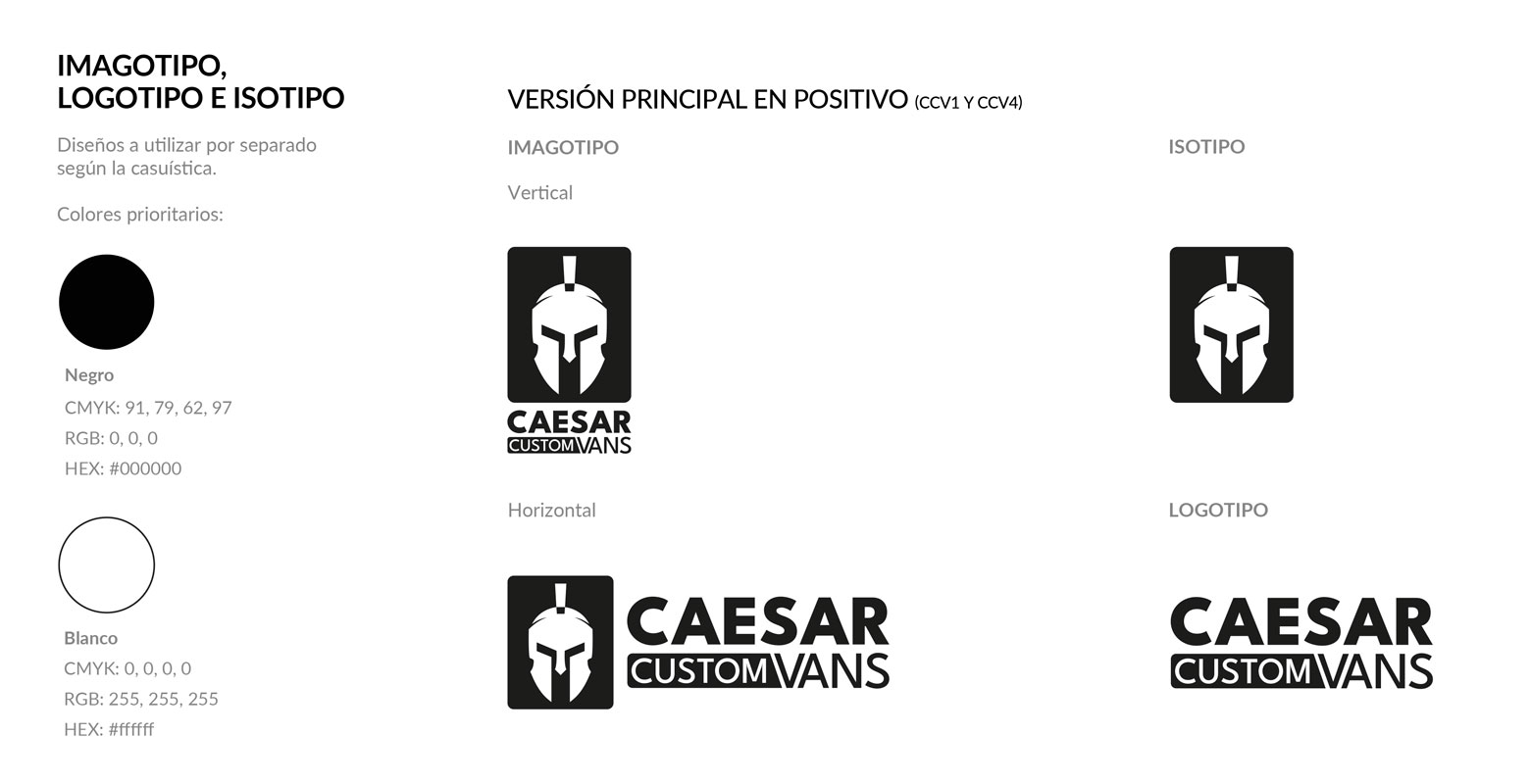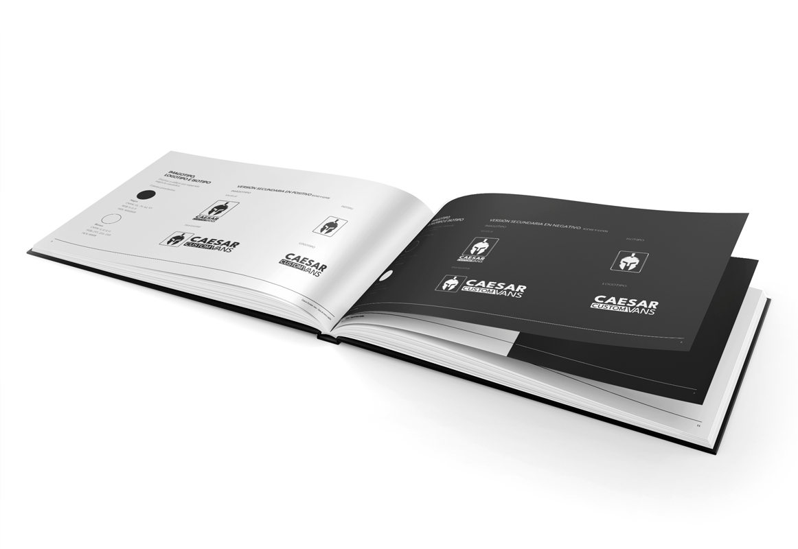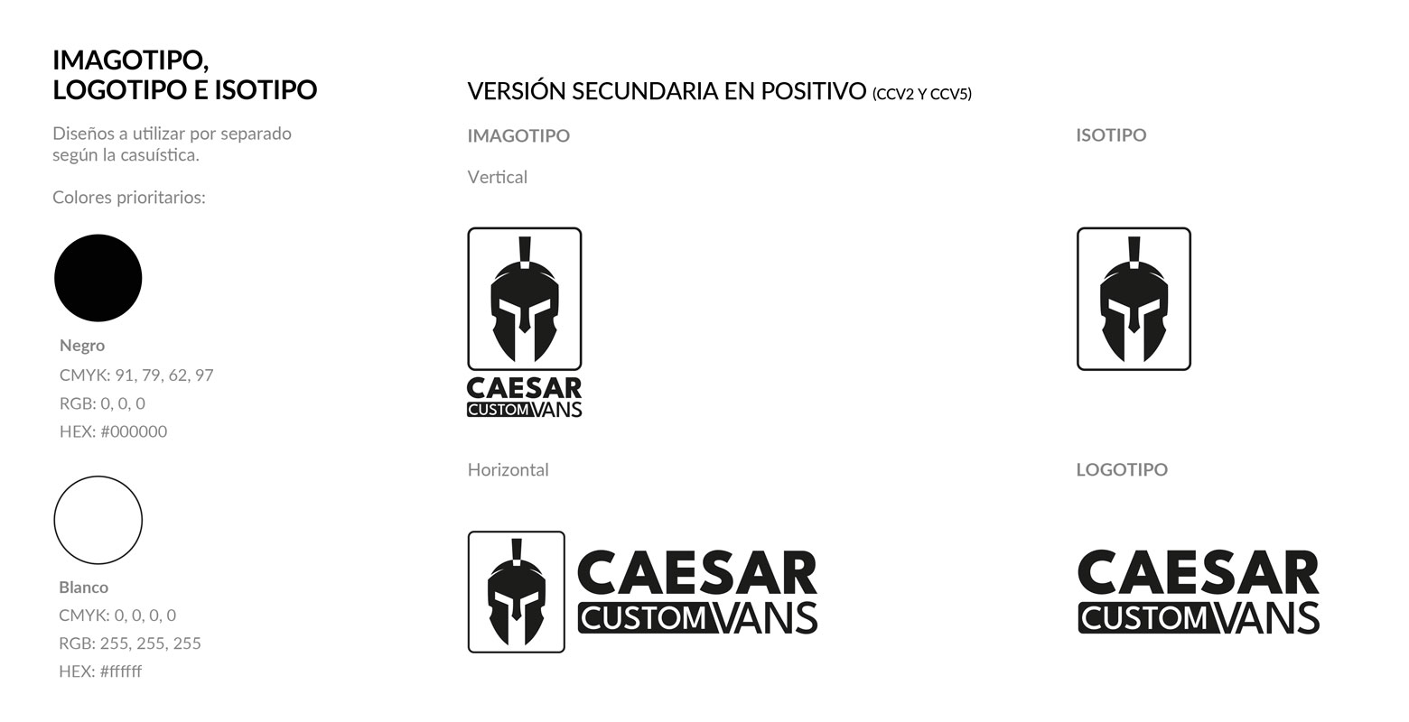 El imagotipo de Caesar Custom Vans se distingue por su potencia visual y su significado intrínseco. Un yelmo estilizado que evoca a la época clásica encabeza el imagotipo. Enmarcado en una pastilla negra, su geométrica presencia y cuidadas líneas se ven realzadas. A continuación, el nombre de la marca. En combinación con el isotipo y escrito en latín, se convierte en una referencia directa a los tiempos de uno de los más grandes conquistadores: César —que el propietario de la empresa se llame igual, es pura coincidencia (guiño, guiño)—. Una referencia directa al buen hacer, a una época dorada en la que la profesionalidad, la calidad de materiales y minuciosidad en los acabados eran parte del día a día. La pulcritud en estado puro.