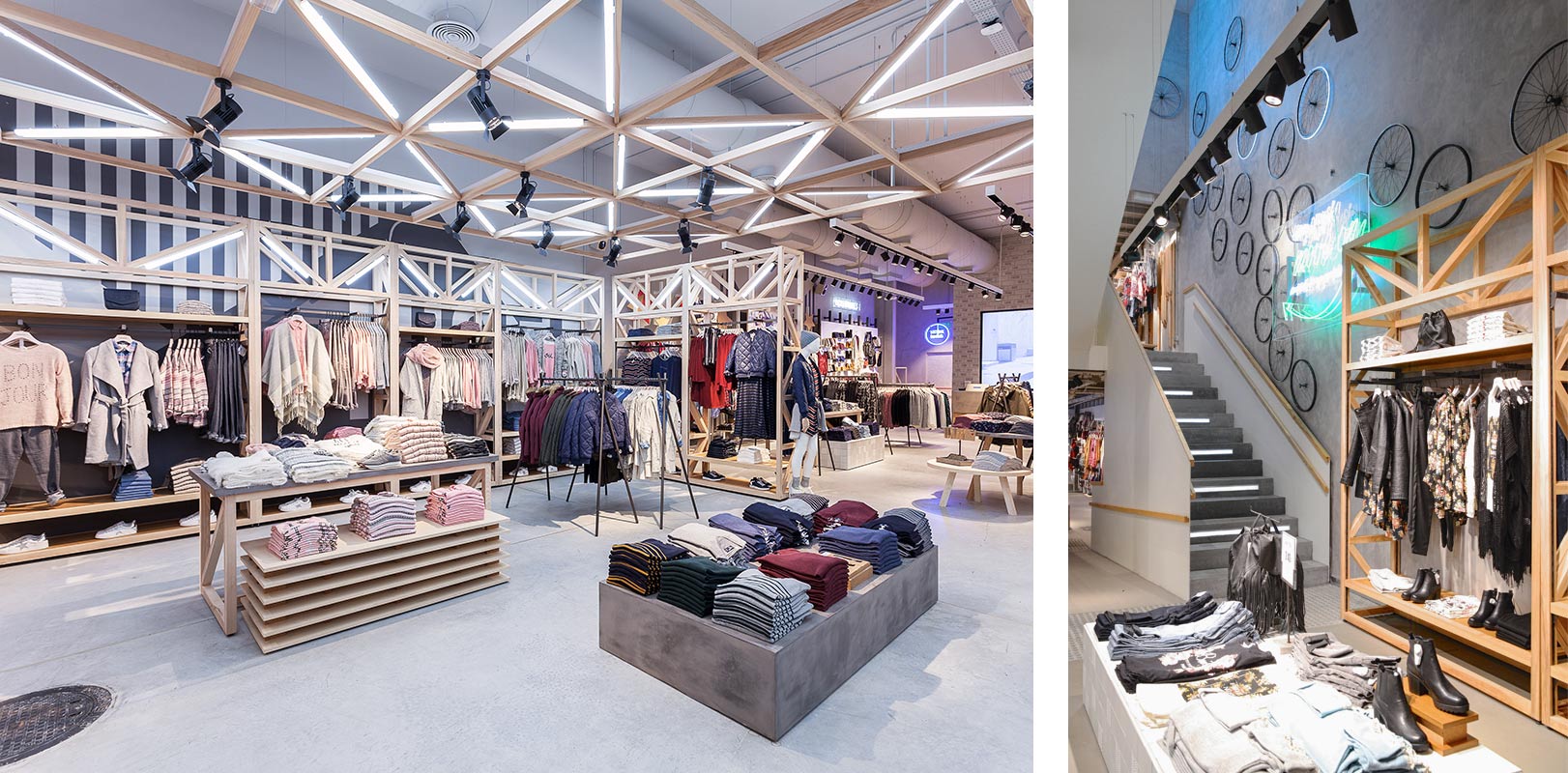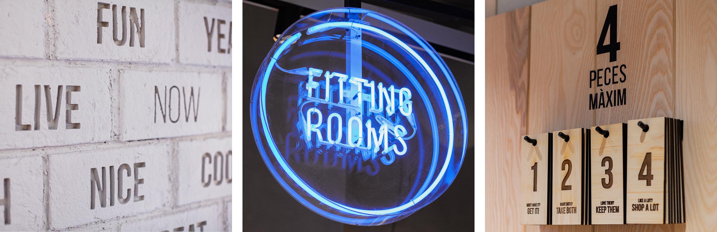 - Creatividades para interior de tienda: realización de diseños específicos según las necesidades de cada tienda para estilizar una zona determinada, reforzar la imagen de marca, colocar mercancía y/o añadir información de interés. Entre estas creatividades se incluyen señalética, composiciones con fluorescentes, textos corpóreos, neones, vinilos, gráficas para pintar sobre la pared, lonas, cubre-alarmas, cajas de luz, expositores, cartelería, adaptación de imágenes de temporada/campaña según soporte… El diseño de cada creatividad incluye su desarrollo acotado junto la previsualización del resultado final, los artes finales/plantillas (en caso de gráficas) y el material a utilizar junto con las directrices a seguir para generar el producto final.