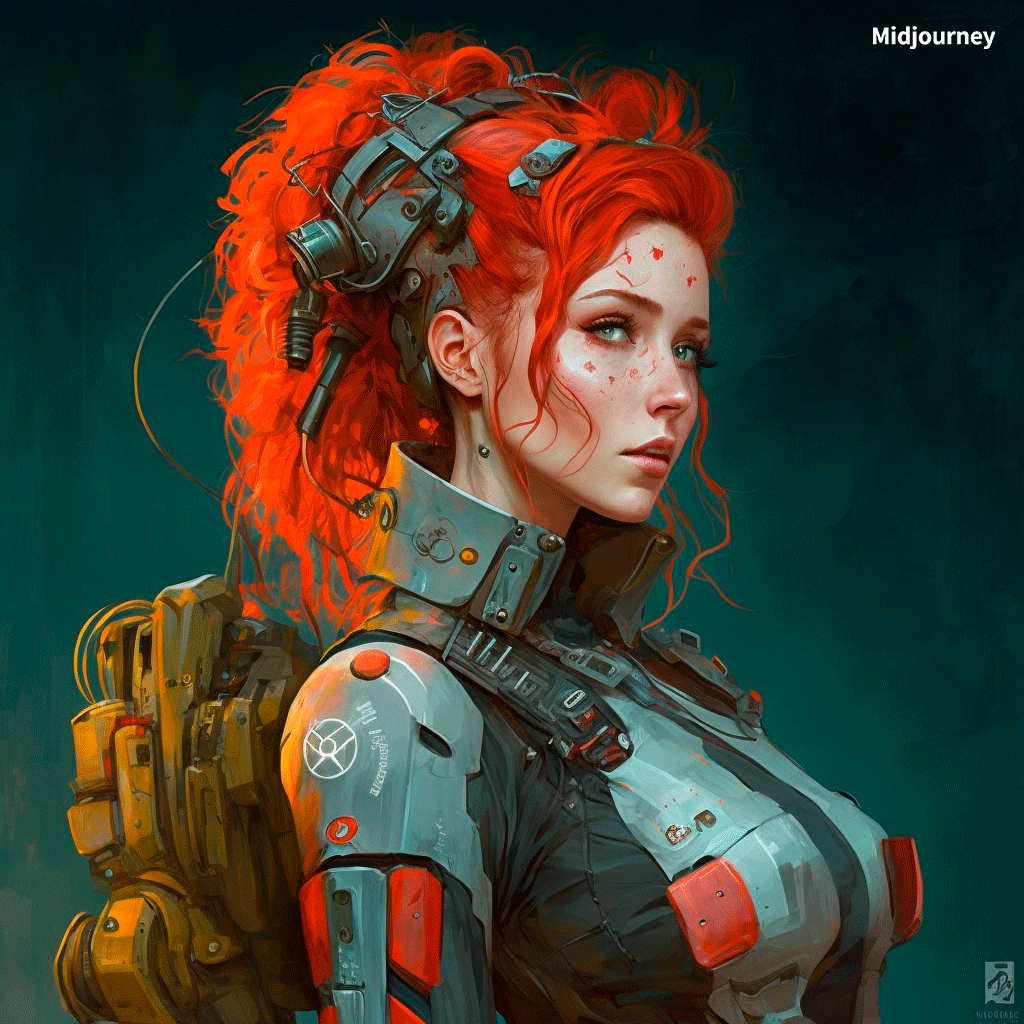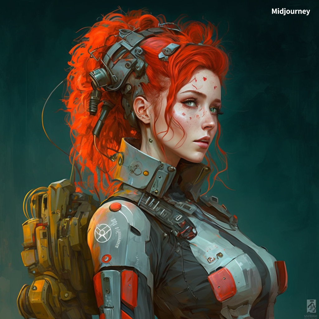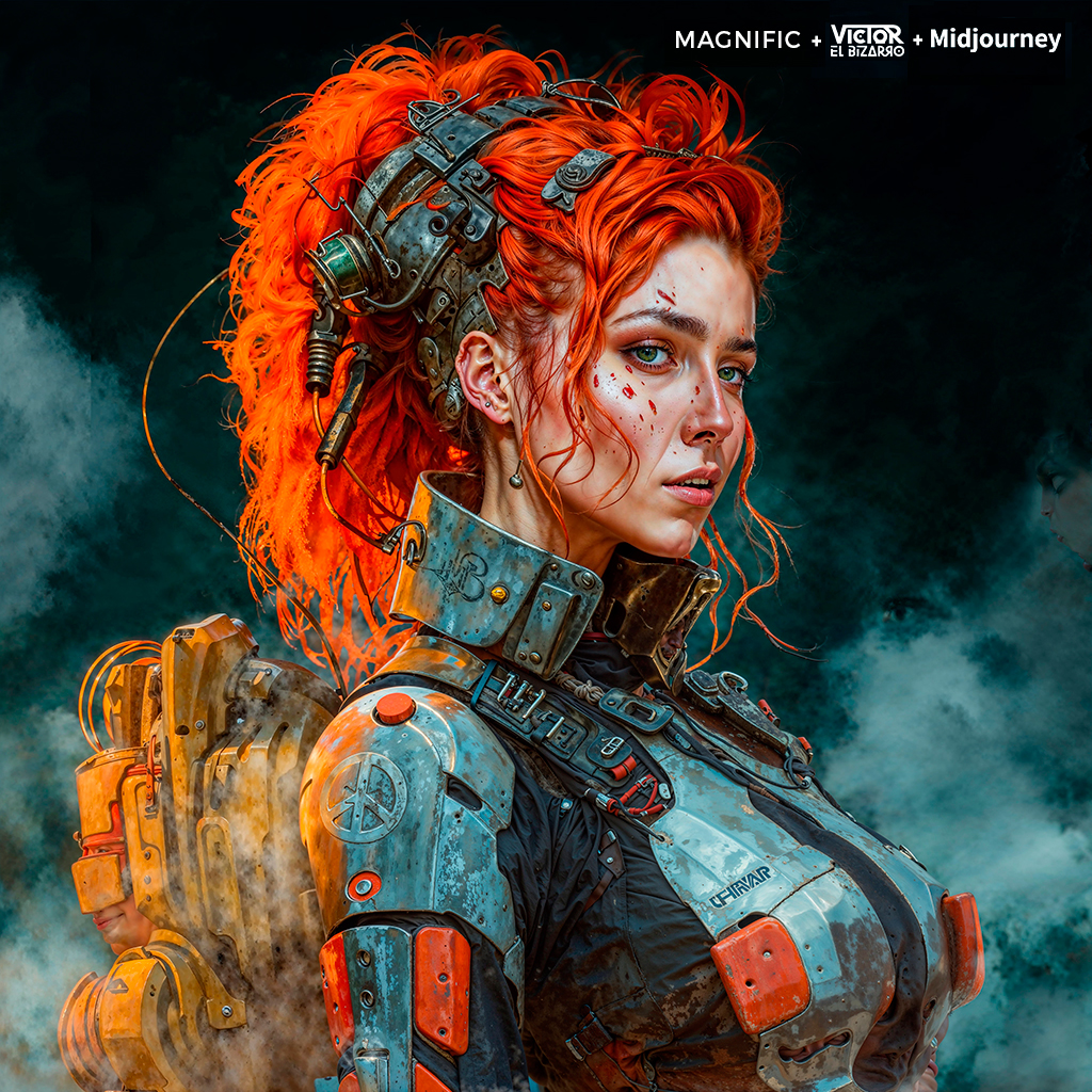 A continuación, puedes descubrir una imagen generada a través de Midjourney mediante el texto que proporcioné al software (beautiful_red_haired_woman_post-apocalyptic_mech_opera_painting) y, después, otra con modificaciones que realicé a mano hasta conseguir el resultado deseado.
