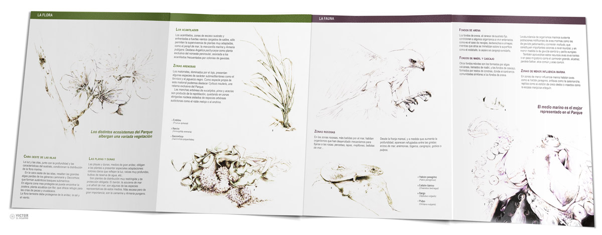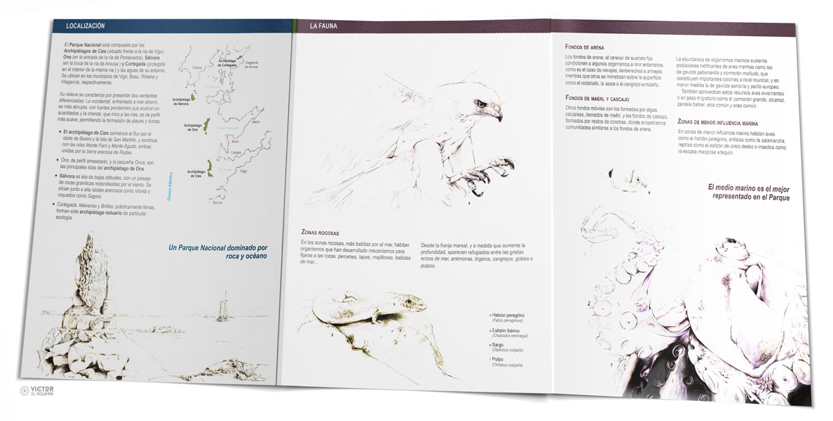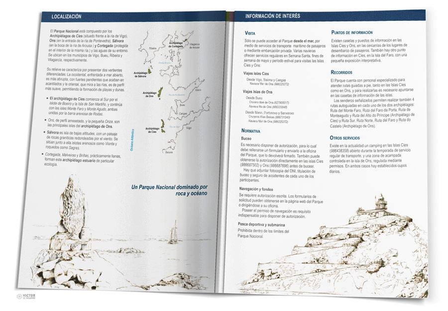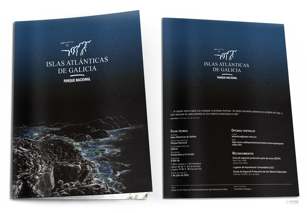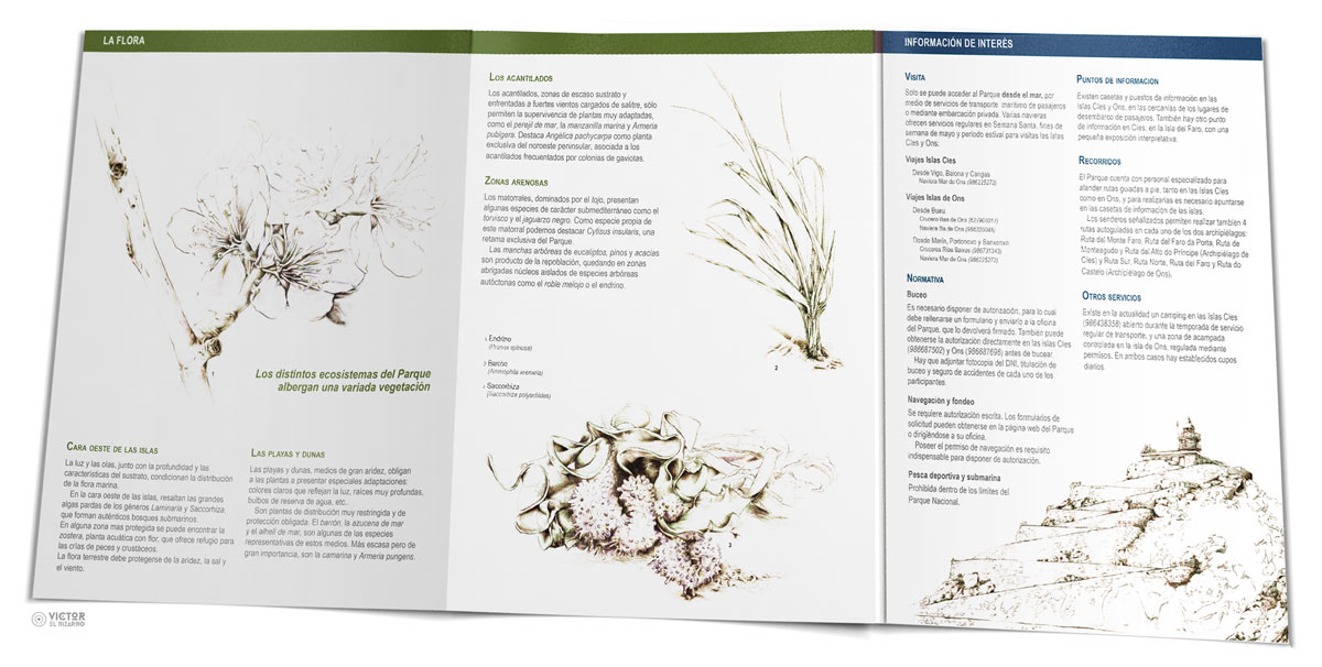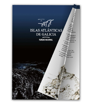 El folleto envolvente del Parque Nacional de las Islas Atlánticas de Galicia (de 17x24cm, desplegado 68x24cm) combina toda la información básica necesaria para conocer de primera mano la localización, datos de interés, flora y fauna autóctonas de este paraje sin igual.