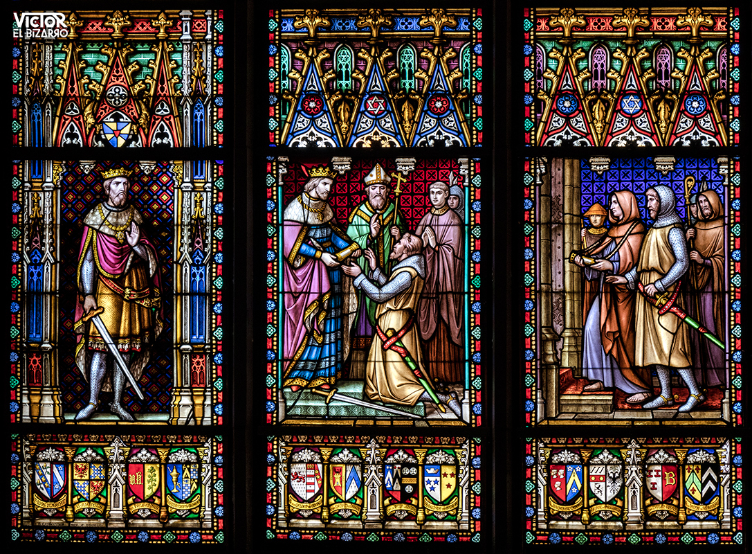 En la fotografía se puede observar en detalle una de las vidrieras situadas en la capilla superior de esta basílica menor, en las que aparecen representados los diferentes soberanos flamencos, desde Margarita de Male hasta la emperatriz María Teresa.